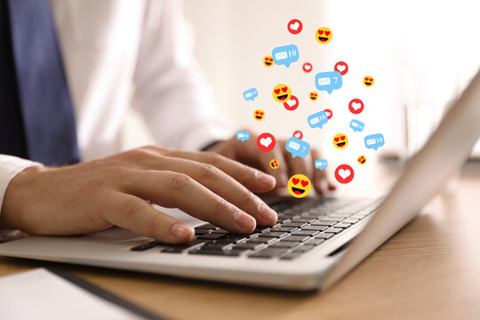 Man using laptop at table, closeup. Social media notifications (messages, likes, emojis) flying out of computer