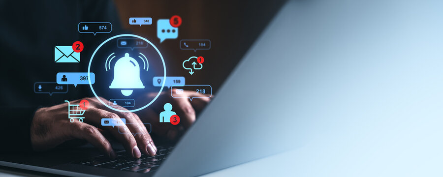 Digital Communication and Notifications: A businessman uses a smartphone with a glowing notification bell and message icons, symbolizing online messaging, social media alerts, and digital communicatio