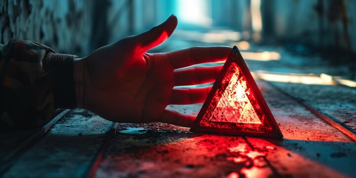 Human hand displaying red triangle alert symbol for maintenance notification error and danger idea.