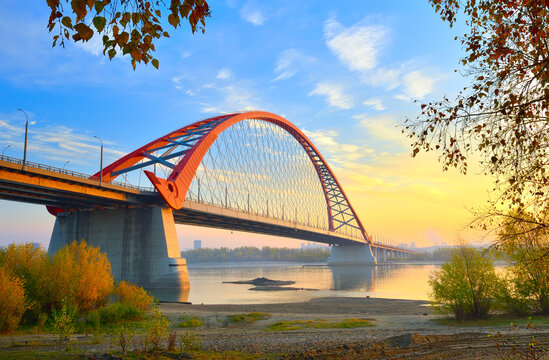 Bugrinsky bridge over the Ob River in Novosibirsk at sunset. A bridge with an orange arch over a river.