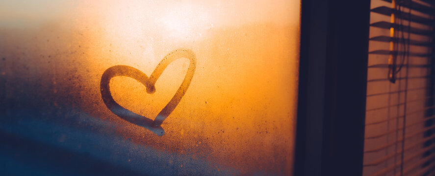 Heart drawn on a misty window during sunset