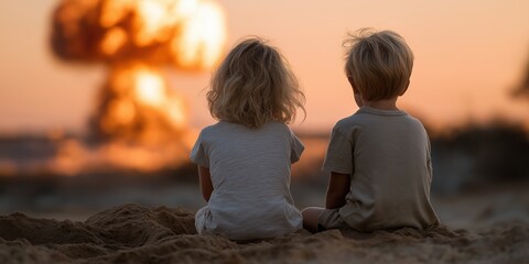 Two children are sitting on the beach, looking at a large explosion in the distance. The scene is peaceful and serene