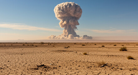 Dramatic mushroom cloud from explosion in desert landscape