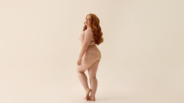 Confident plus-size woman posing in nude lingerie with neutral backdrop. Concept of expressive movement, celebration of joy and curves, energetic branding for underwear.