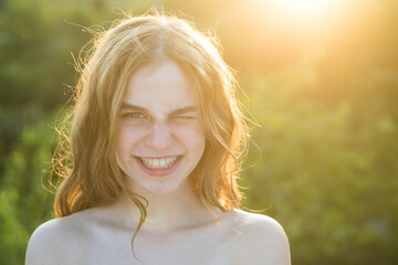 Attractive young woman in profile with perfect skin. Brunette lady, plump lips, nude shoulders. Facial beauty, cosmetology. Spa, skincare, bodycare, wellness. Healthy, clean skin tone. Grey