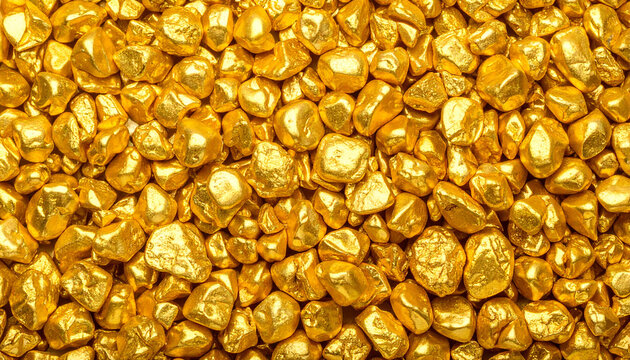 Golden nugget cluster fills frame, creating luxurious, shiny, and opulent background, evoking wealth and prosperity with rich, metallic texture and vibrant yellow color