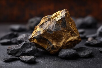 Close-up of nugget of gold ore surrounded by dark stones