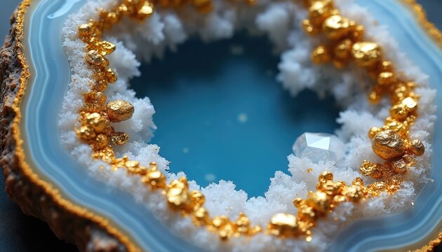 Macro view of geode cross section revealing white crystal cluster formation with rough gold nuggets inside blue void. Natural mineral slice shows detailed rough textures and shiny golden elements.