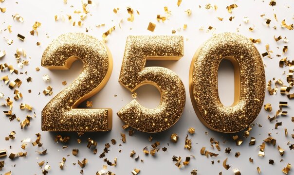 Glimmering Gold Number 250 Surrounded by Shiny Confetti Pieces