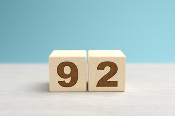 Wooden toy blocks forming the number 92.