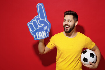 Amazed bearded hipster man pointing with fan glove and celebrating victory of favorite team.