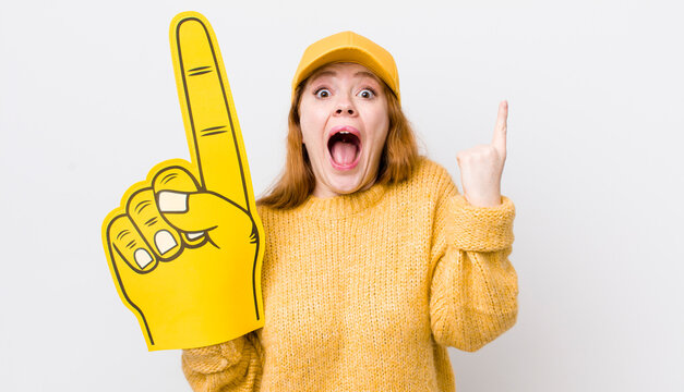 red head pretty woman feeling like a happy and excited genius after realizing an idea. number one hand fan concept