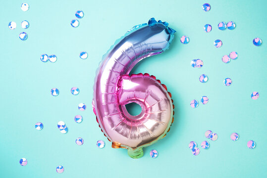 Creative layout. Rainbow foil balloon number and digit six 6. Birthday greeting card. Anniversary concept. Top view. Copy space. Stylish colored numeral over blue background. Numerical digit.