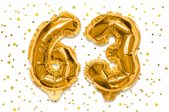 Orange balloon number 63 for sixty-third birthday or anniversary party. White background with confetti