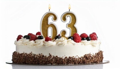Decorated gold cake for birthday or anniversary party, candle number 63, white background
