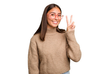 Creative layout. Rainbow foil balloon number and digit two 2. Birthday greeting card. Anniversary concept. Top view. Copy space. Stylish colored numeral over blue background. Numerical digit.