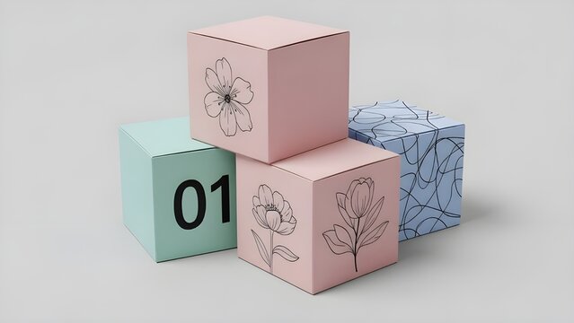 Aesthetic pastel colored packaging boxes featuring floral and numeral designs