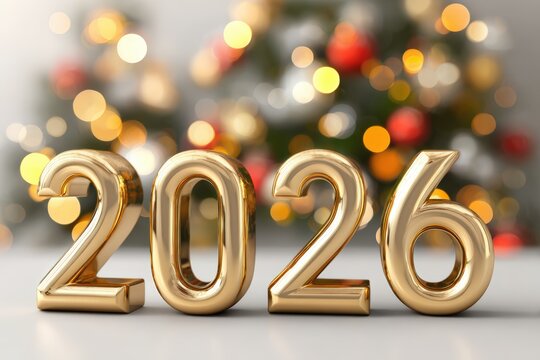 Golden digits of 2026 stand prominently against a blurred, festive background of twinkling lights, ideal for New Year promotions, celebrations, or holiday-themed content,