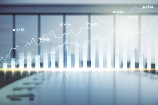 Multi exposure of virtual abstract financial diagram on a modern furnished office interior background, banking and accounting concept