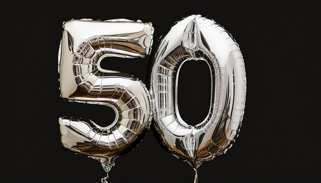 Silver balloon number 50 over isolated black backdrop. Birthday celebration. Anniversary card.