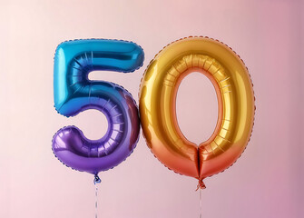 Shiny metallic gold foil balloons form the number 50, creating a festive and celebratory atmosphere for a milestone birthday or anniversary celebration