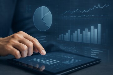 デジタルタブレットでデータ分析を行うビジネスパーソンの手元とグラフの未来的コンセプト