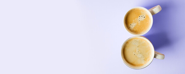 Couple white cups with coffee on trendy ultraviolet purple color of year 2022 background, Woman day 8 march celebration concept. Greeting card, banner, flyer, invitation, Copy space.