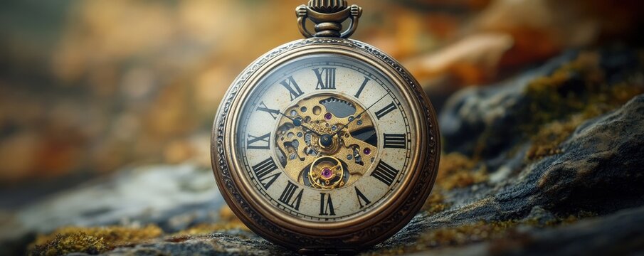 A close-up of a vintage pocket watch, showcasing intricate gears and Roman numerals against a natural backdrop.