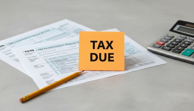 Desk showing a bright orange sticky note with tax due text, sitting on top of tax return forms with a pencil and calculator nearby, illustrating accounting and financial planning