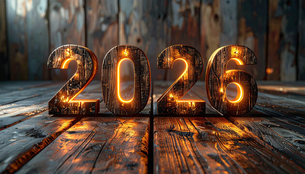 Three-dimensional wooden numbers '2026' floating above a rustic wooden floor