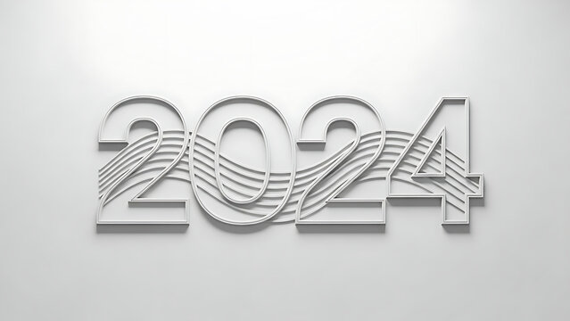 Illustration of 2024 metallic embossed text with wavy lines on gray background