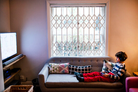 Boy sitting up on sofa playing video game using game controller