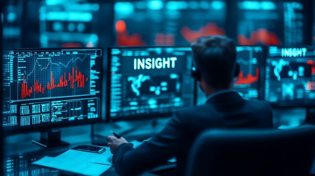 A focused individual analyzes data on multiple screens in a high-tech environment, showcasing insights and financial trends.