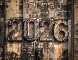 Large stone numbers, "2026," carved into a weathered building facade