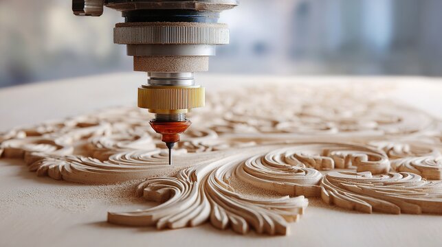 Intricate cnc machine wood carving detail in workshop setting