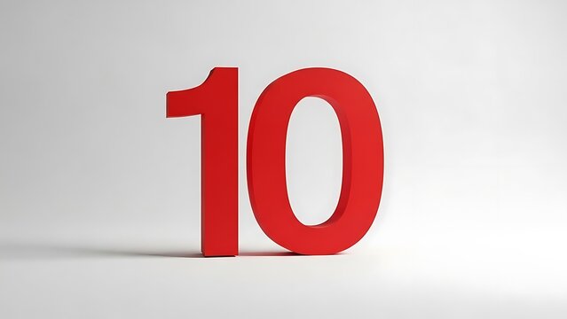 A large red number ten sits on a plain surface in bright lighting conditions.