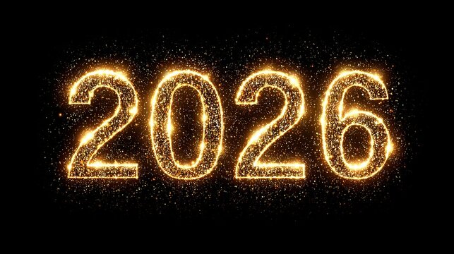 Sparkling golden year 2026 numerals shimmer with celebratory dust against a deep black background, perfect for festive announcements and projections.