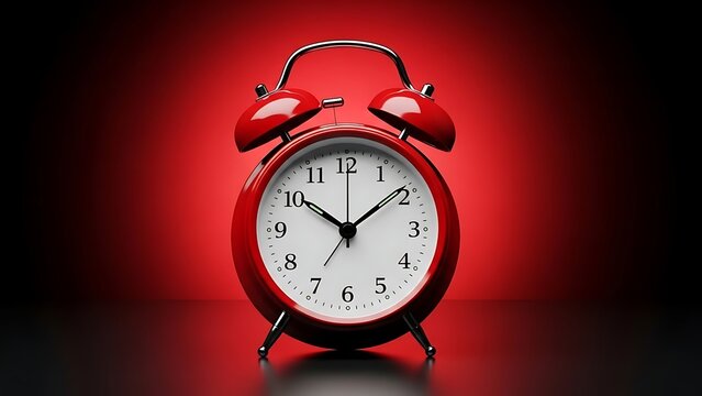 Red vintage alarm clock with twin bells and white face illuminated brightly
