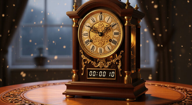 Ornate vintage wooden clock with a digital ten-second countdown, set on a polished table in a warm, softly lit room, evoking anticipation of passing moments