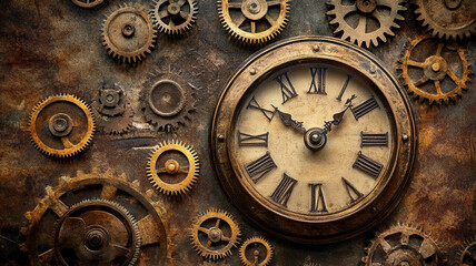 Vintage clock with intricate gears and Roman numerals set against a weathered metal background