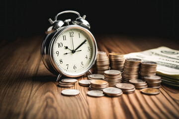 alarm clock and coins with banknotes on wooden table surface as time value concept