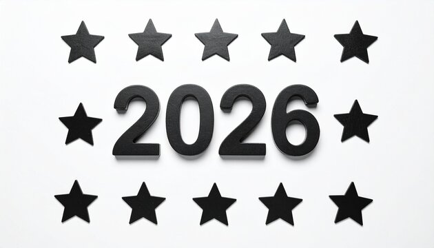 Bold “2026” framed by black stars—ritual of milestone gaze and celebratory breath, where monochrome contrast choreographs the emotional architecture of anticipation, reflection, and symbolic renewal.