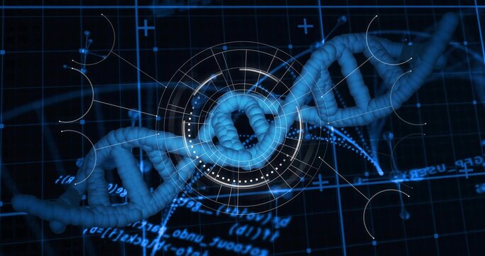 Displaying DNA helix rotating within blue grid matrix, with HUD overlay and numeric annotations