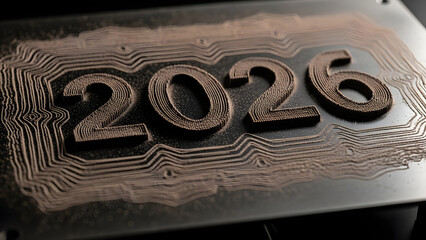 Chrome 2026 numerals with glowing teal circuit traces conveying futuristic ai technology