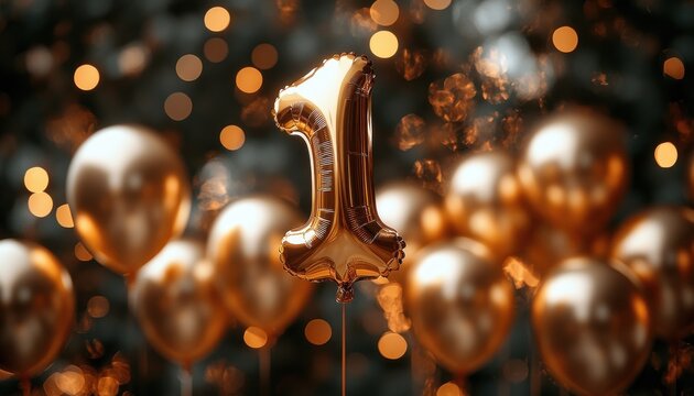 Golden Balloon Celebration for One Year Anniversary with Copy Space on Yellow Background and Shiny Bokeh Effects