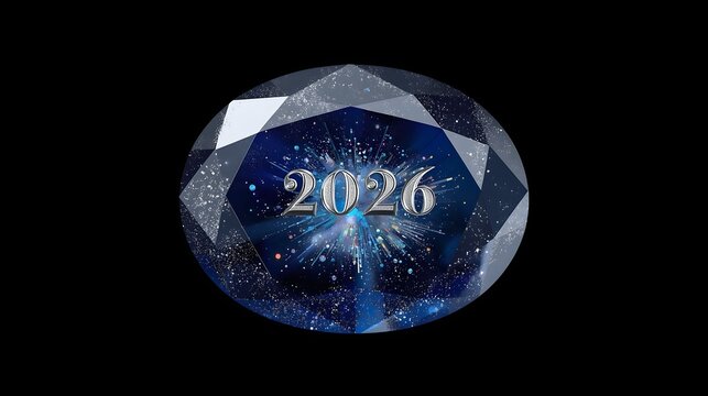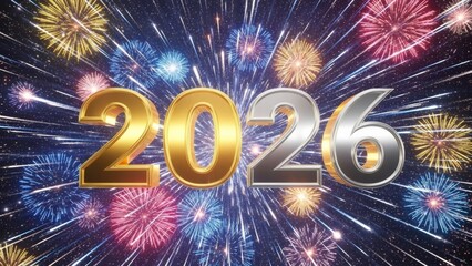 Golden and silver 3D text for the year 2026 placed against a spectacular background of vibrant, exploding fireworks, symbolizing a festive New Year's celebration and future prosperity.