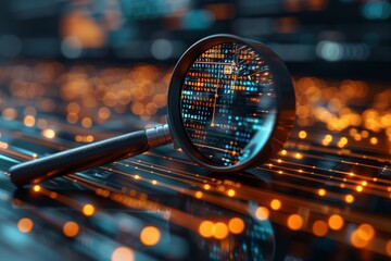 A close-up shot of a magnifying glass focused on a digital data infographic chart, highlighting the importance of data analysis in the future