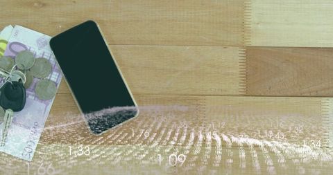 Smartphone, cash and keys on wood table with fingerprint overlay for mobile security