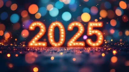 Glowing 2026 numerals pulsing with neon mosaic tiles, confetti particles, digital glow