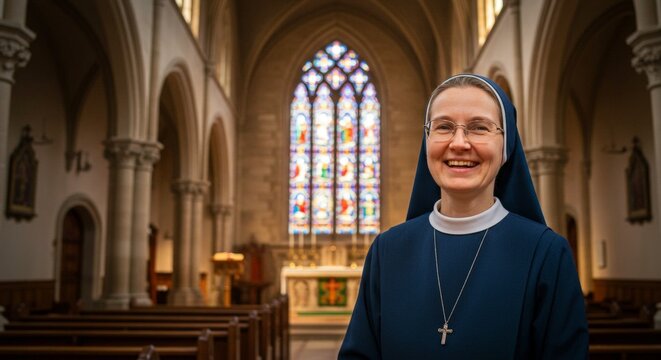 Serene caucasian nun in black habit deep in prayer inside the church, a devout portrait